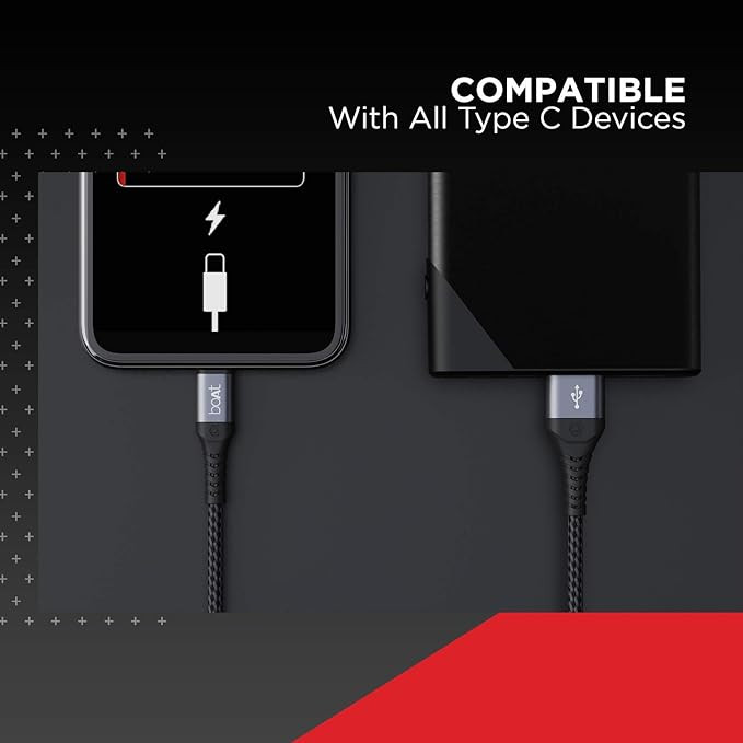 The boAt Type C A550 cable is compatible with smartphones, tablets, PC peripherals, Bluetooth speakers, power banks and all other devices with Type-C ports.