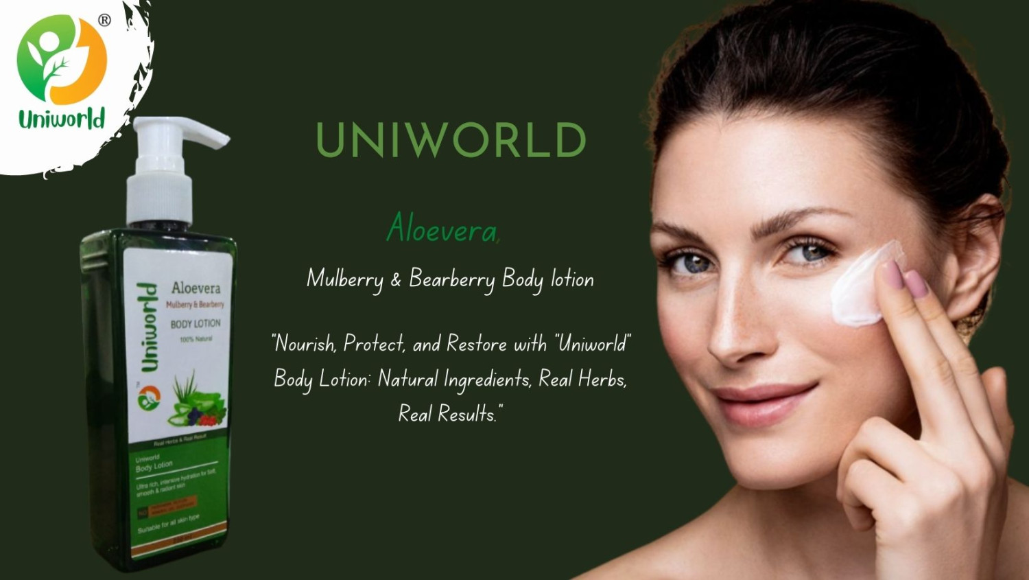 UNIWORLD Body Lotion: Aloevera, Mulberry & Bearberry Blend for Nourished Skin. Infused with Ayurvedic Oils - Almond, Soya, Rose, and Sandalwood. No Paraben, Silicon, Mineral Oil, or Sulphate. Protects against Sunburn & Pigmentation. Made with Natural Ingredients for All Skin Types. Restores Natural Fairness & Glow. Real Herbs for Real Results.