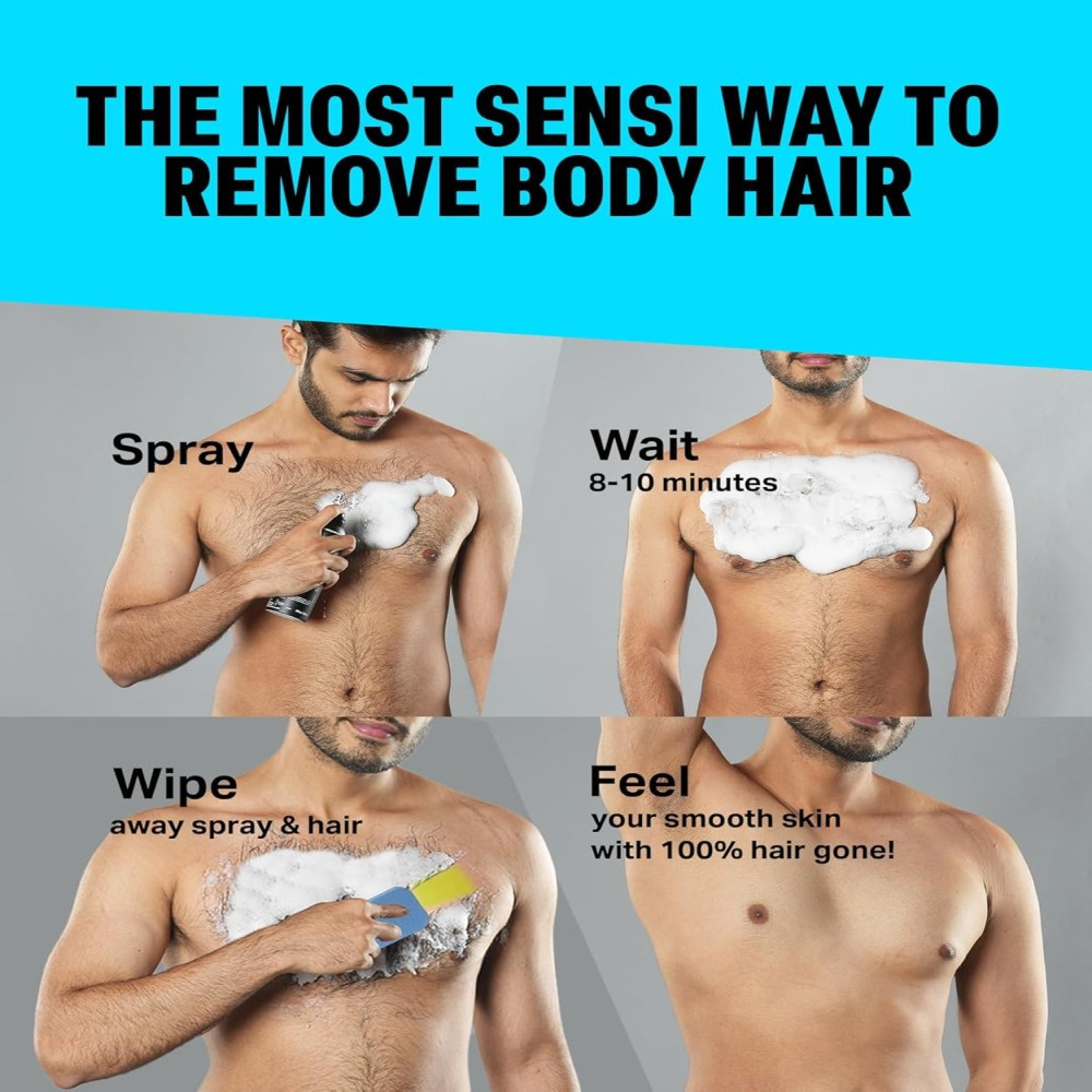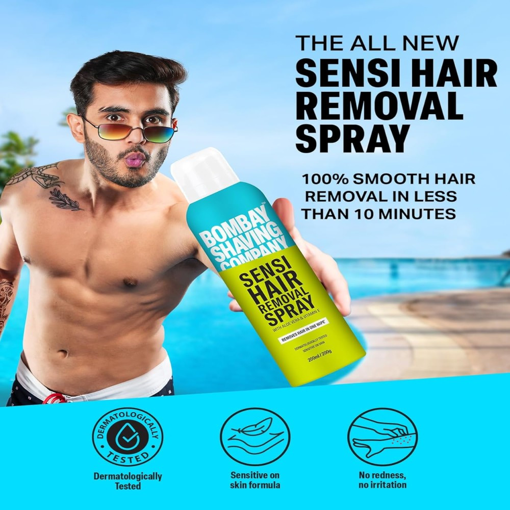 Bombay Shaving Company’s Sensi Hair Removal Spray (200 GMS) is a painless, irritation-free grooming solution designed for quick and effective body hair removal, especially suited for sensitive skin. It’s ideal for use on chest, arms, underarms, and legs, and comes with a pleasant citrus-chamomile scent.