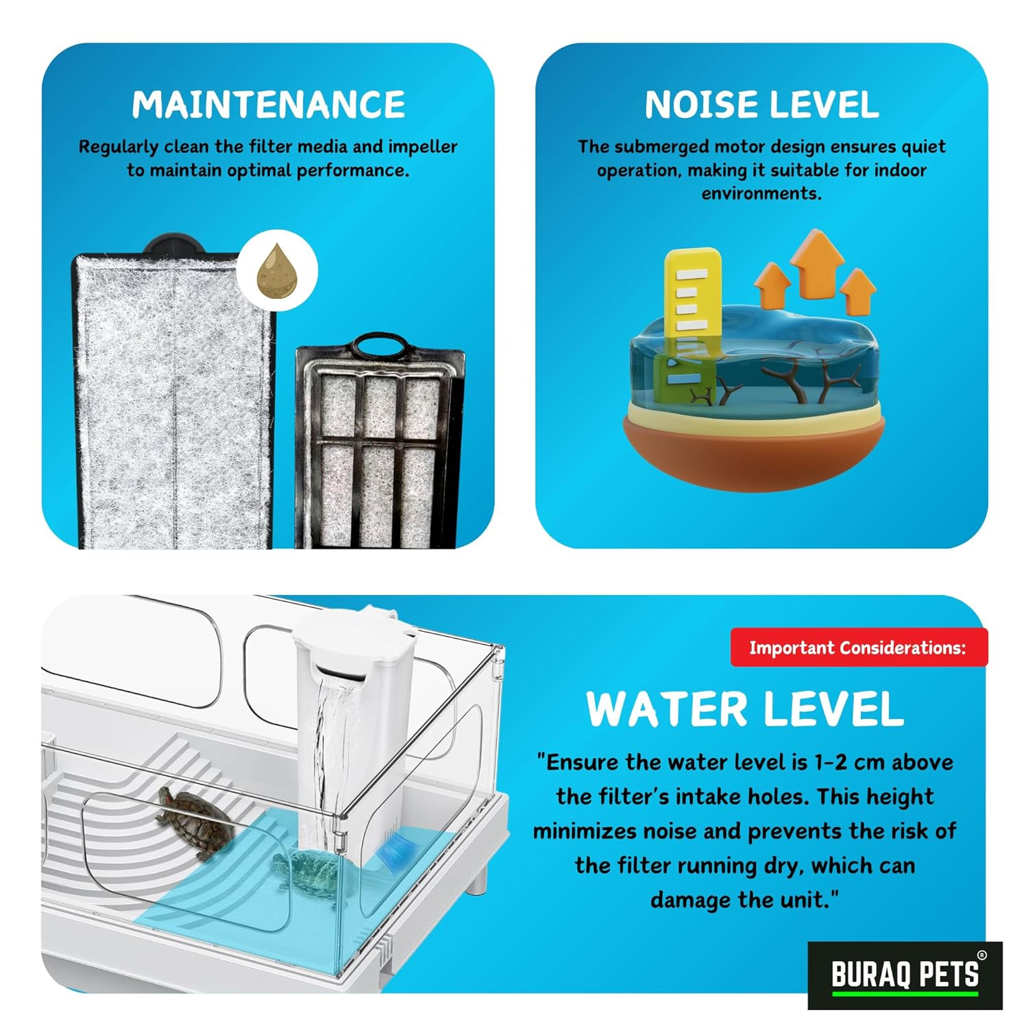 • Compact & Powerful Filter - 3.5W 350L/H Can be used in various water level tanks. Specially designed for low water level, But it's better to keep the water level 1-2cm higher than the water input holes to reduce noise and prevent dryburn, suitable for small and medium-sized fish and turtle tanks .