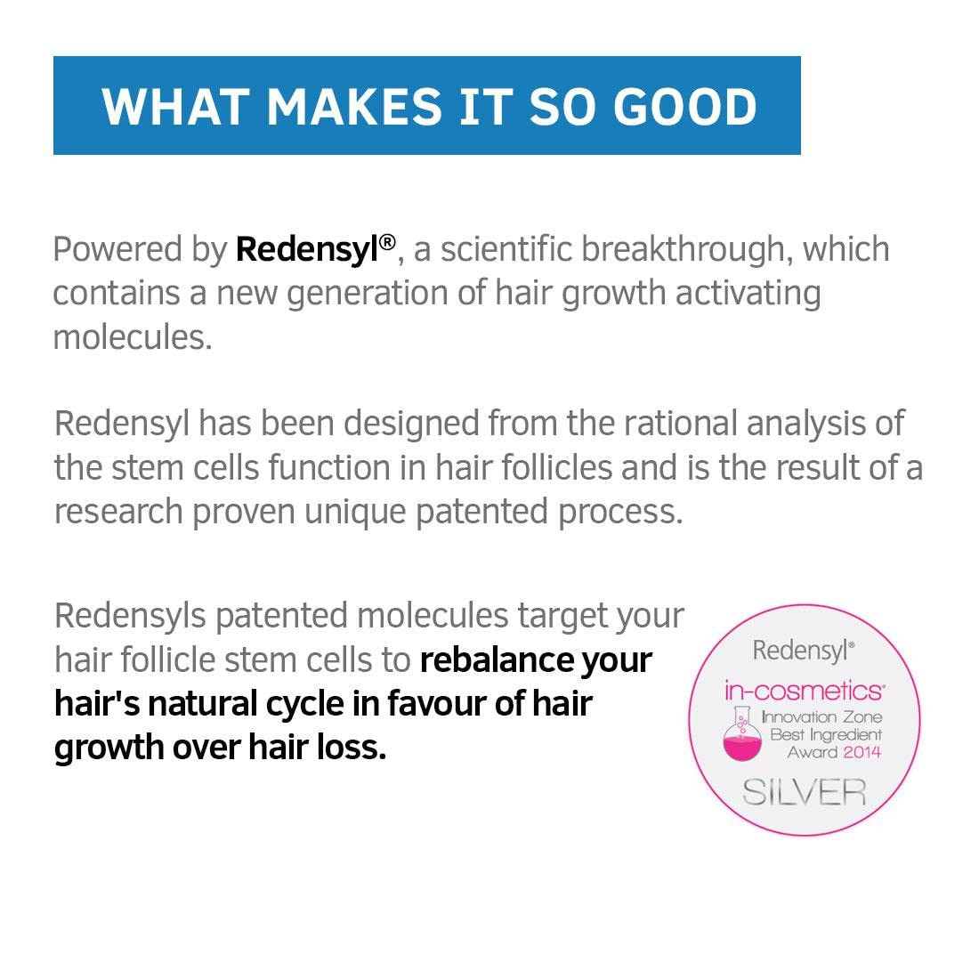 Redensyl - works on both hair roots and shaft, to re-balance hair's natural cycle for hair growth.