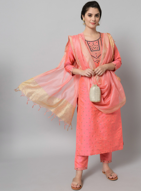 embroidered pink kurta with pink trousers and dupatta -