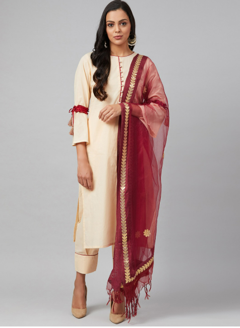 Kurta-Pant-Dupatta set will leave you in awe of its intricately embroidered on the front yoke and the sleeves. the kurta comes with a lovely line of embellishments at the bottom as well to get you festive-ready! The pants with this ensemble promise to provide the perfect fit by providing elasticated at the back to give you the utmost comfort whilst leading the fashion game. The kurta trouser set is layered it with the lightweight yet soft chanderi dupatta given with this set to complete the look.