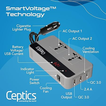 Ceptics 200W Car Laptop Charger/Power Inverter with 2 USB(3.1A Max) + 1 C Type(1 * 18W PD) Smart USB Charging Ports, 12V DC to 220V AC, 2X Universal AC Outlet, Grey, 18 Months Warranty