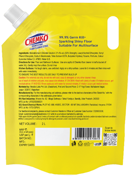 Introducing the Chemko Disinfectant Citrus Floor Cleaner, the ultimate solution for maintaining a spotless and germ-free environment in your home or workplace. Harnessing the power of citrus, this potent cleaner not only effectively eradicates dirt and grime but also leaves behind a refreshing, zesty fragrance that invigorates your space. Its advanced disinfectant formula ensures that harmful bacteria and viruses are eliminated, providing peace of mind for you and your family. Easy to use, this floor cleaner is perfect for all types of surfaces, making your cleaning routine efficient and enjoyable.