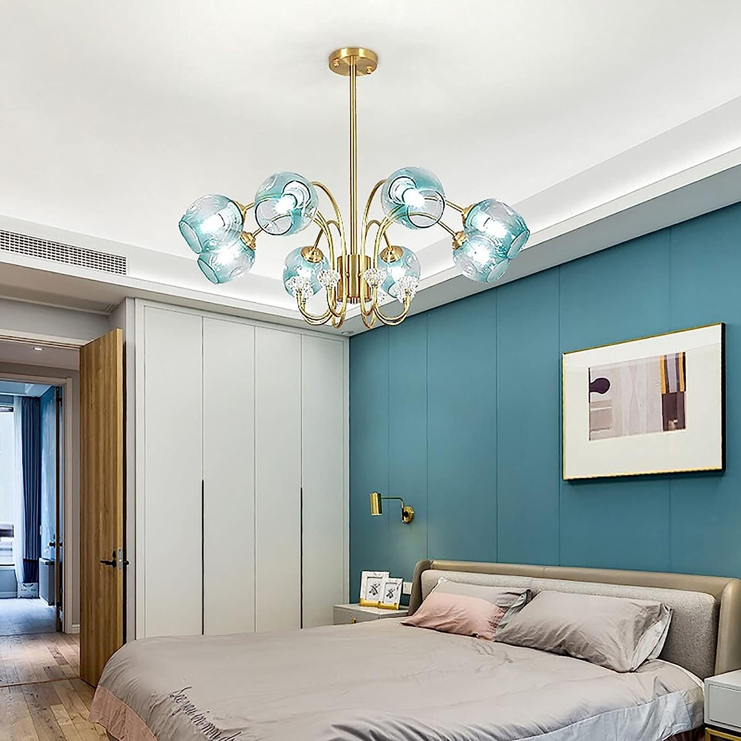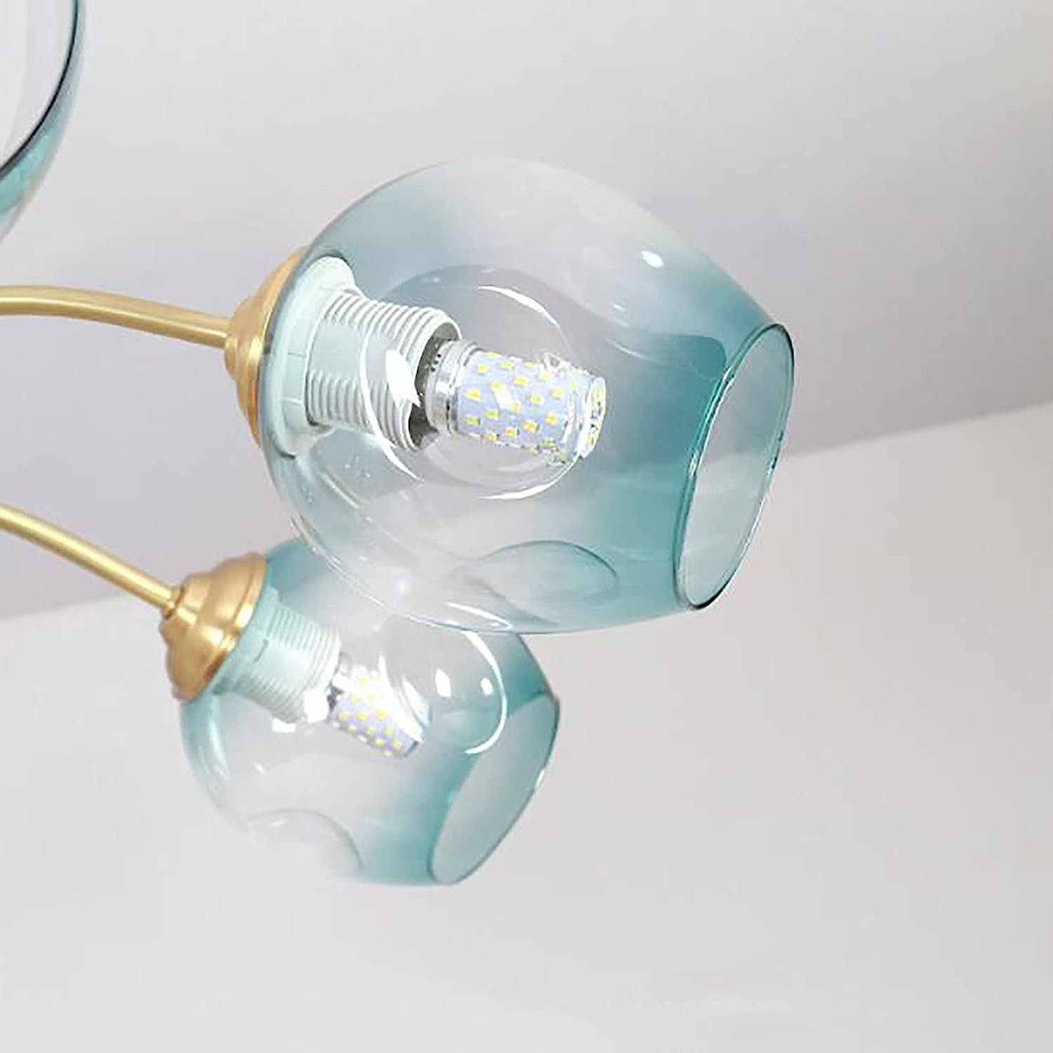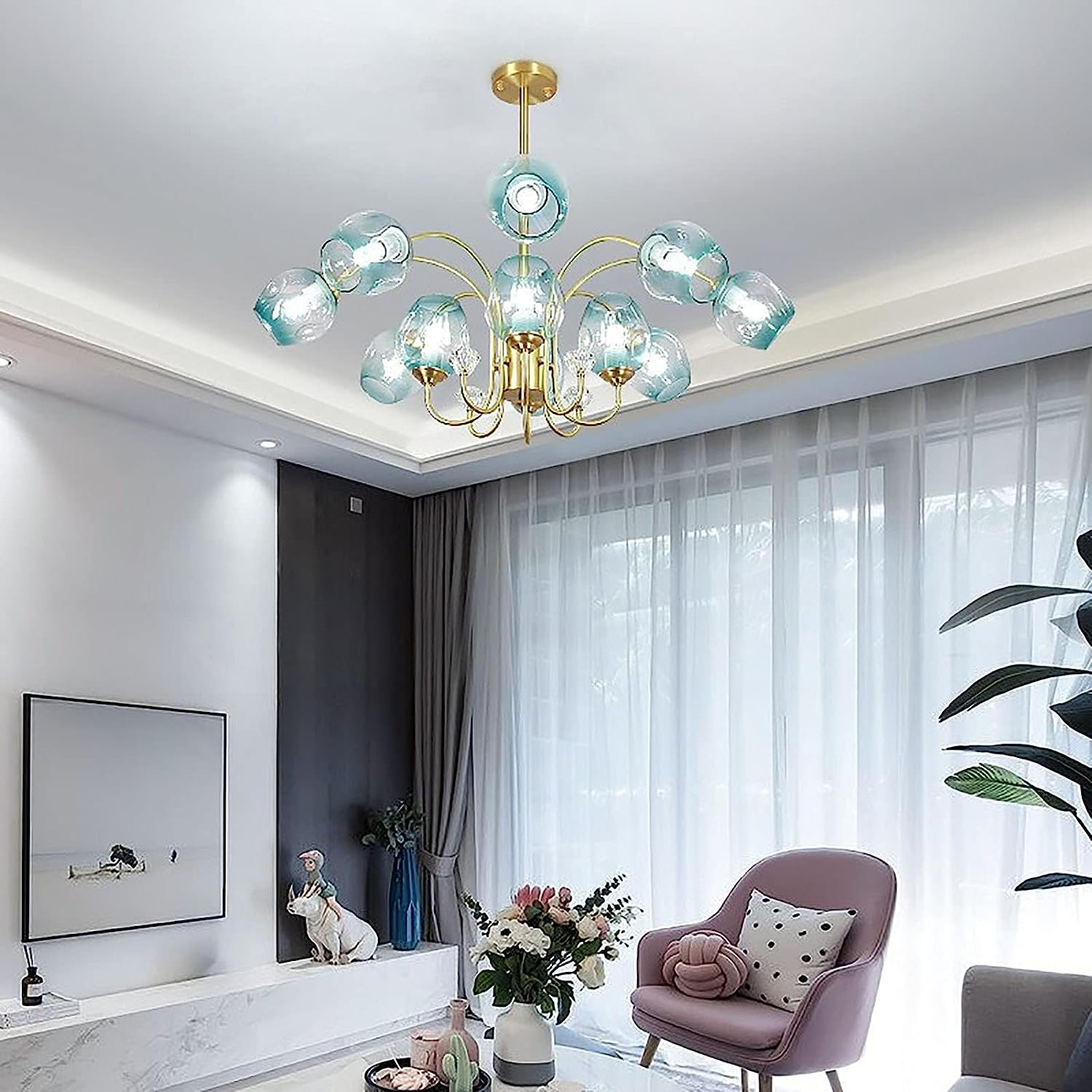 Creativity Industrial Brass Chandelier E27 Modern Light Luxury Pendant Lights with Glass Globe Shade Ceiling Lights for Living Room Dining Room Bedroom-Copper Blue Cover 10 Lights