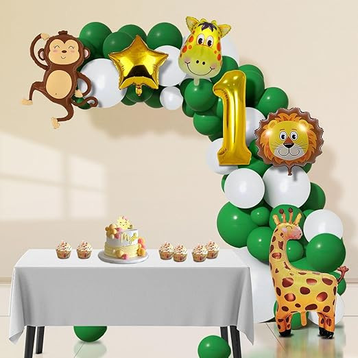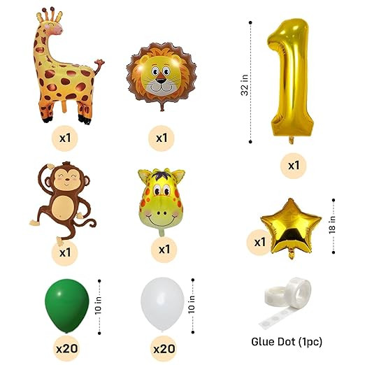 Included Components 1st Birthday Foil Balloon - 1pcs, Animal Foil Balloons - 5pcs, Glue Dot - 1pcs, Green Latex Balloons - 20pcs, White Latex Balloons - 20pcs1st Birthday Foil Balloon - 1pcs, Animal Foil Balloons - 5pcs, Glue Dot - 1pcs, Green Latex Balloons - 20pcs, White Latex Balloons - 20pcs