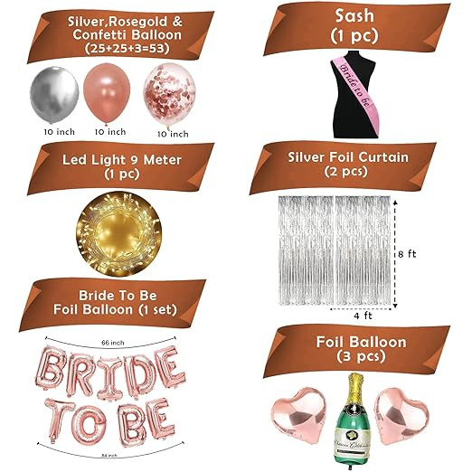60 Pcs | ELEGANT ALL IN ONE COMBO: this xclusive package includes bachelorette party Rose gold ring "Bride To Be" foil balloon, 25pcs rose gold metallic, 25Pcs silver metallic, 3pcs rose gold confetti, 2pcs heart foil, 2pcs silver fringe foil curtain, 1 Pc Champagne Foil Balloon and 1pc bride to be sash for bride to be parties, bridal shower, Kalera function, bachelor parties, Quarantine Bride to be decoration.