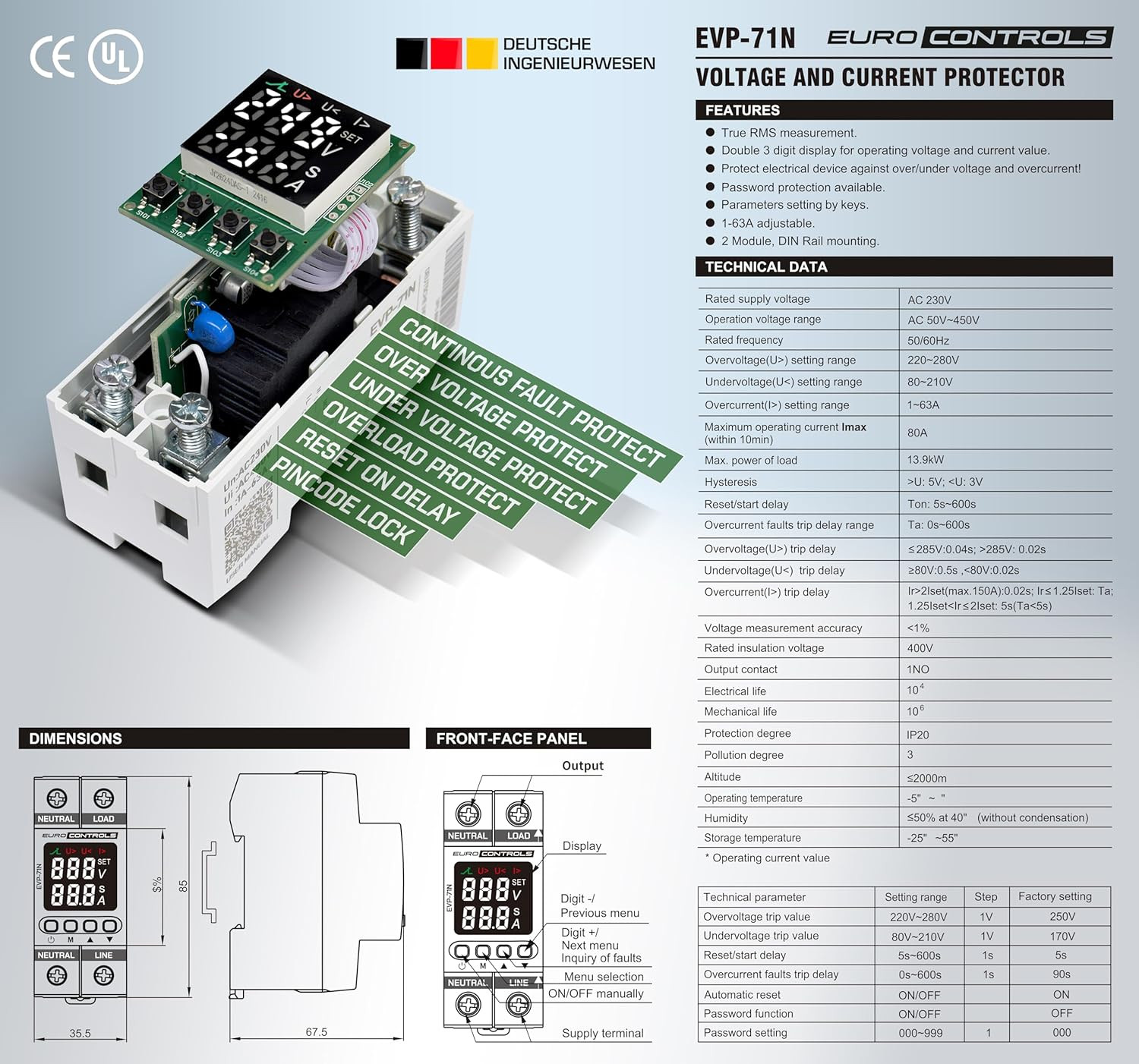EuroControls Euro Controls Automatic voltage protector EVP63F with Auto Recovery - Din Rail Mount - Single Phase - 63Amps 220V - Preset Over Voltage > 270v Under Voltage < 170v Ac