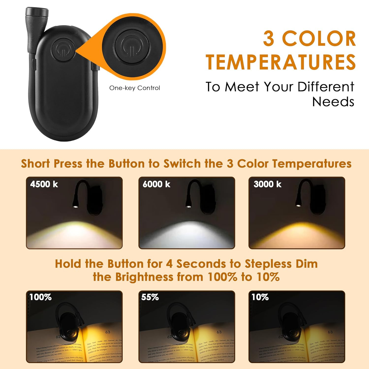[ 3 Color Modes & Eye Caring ] Unlike other book lights, our tiny reading lights for books in bed has 3 different reading modes: Warm White (3000K), Natural White (4500K), and Cool White (6000K). Warm White filters 99.9% blue light to protect your eyes and reduce your eye strain. The Natural White provides you with a cozy and comfortable reading world for novel reading & poem reading. The Cool White highlights the area clearly and so you can concentrate on every detail of your book.