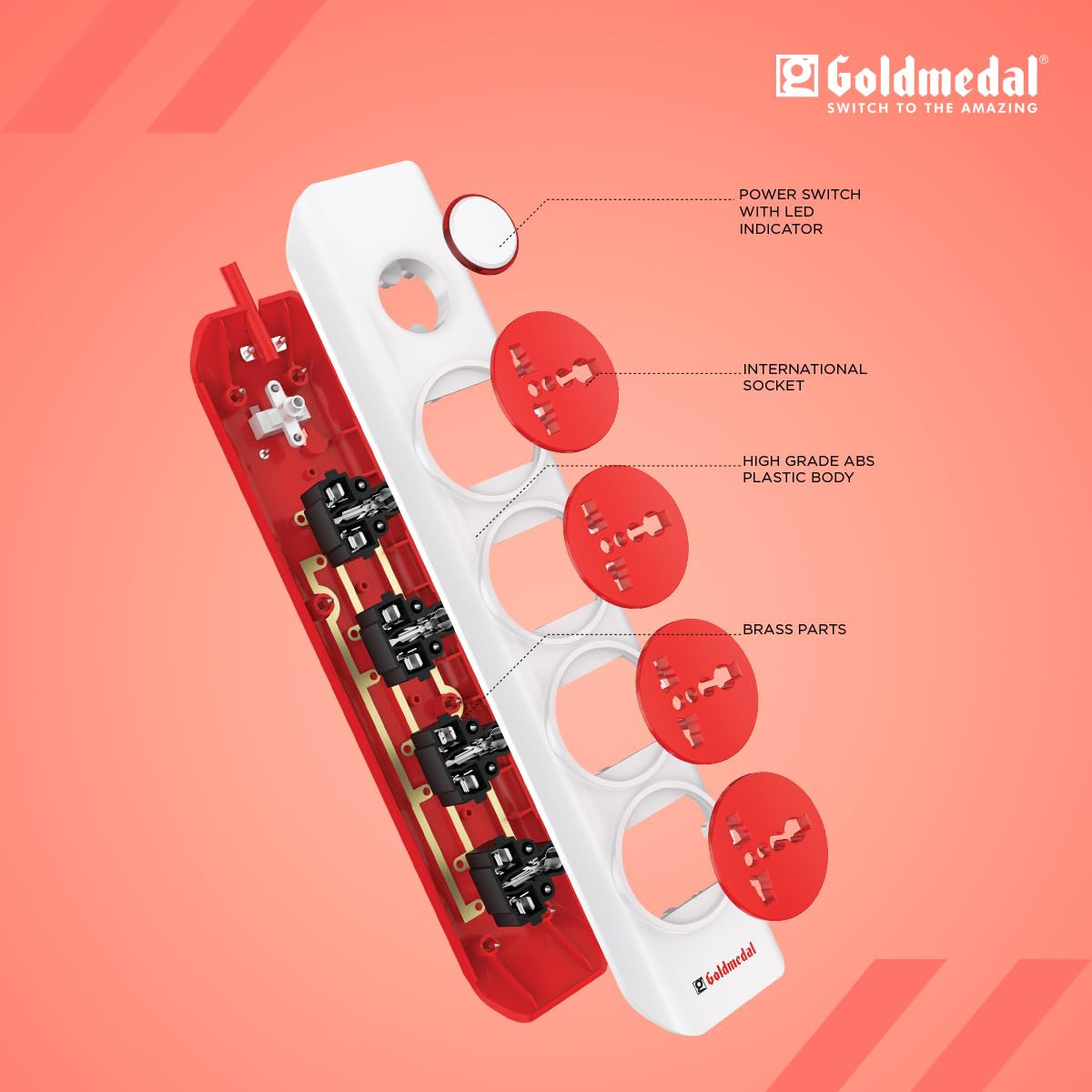 Goldmedal I-Design 4X1 Power Strip With 4 International Sockets,Master Switch,Indicator And 2-Meter Power Cable –White,Pack Of 1,Made With Fire-Retardant Material,Suitable For All Type Plugs,240Volts