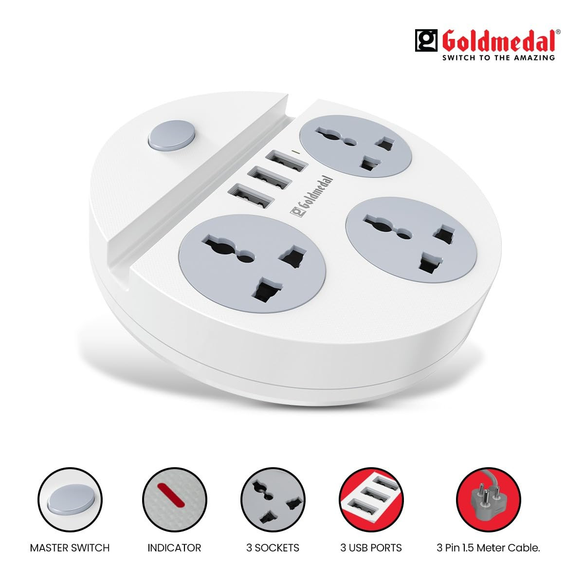Goldmedal Zippo 1.5 Meter Cable Power Strip with 3 Charging USB Ports, Master Switch with Indicator, 3 Outlet International Socket, Compatible with All Devices, Pack of 1 for Home & Office (White)