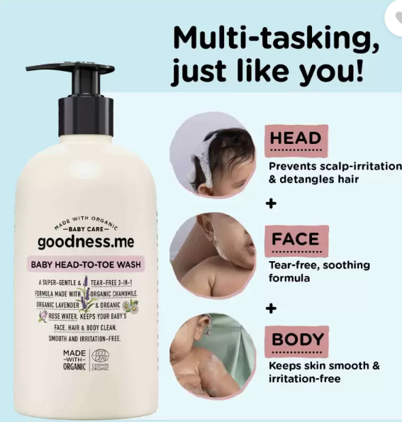 GOODNESS.ME Baby Head-to-Toe Wash, the ultimate gentle cleansing solution designed specifically for your little one's delicate skin. Formulated with natural ingredients, this all-in-one wash provides a soothing experience while effectively cleaning your baby's hair and body. Enriched with nourishing botanical extracts, it leaves your baby's skin feeling soft, hydrated, and refreshingly clean without any harsh chemicals. Make bath time a delightful ritual for both you and your baby with this lovingly crafted product that promises to care for your child’s needs.