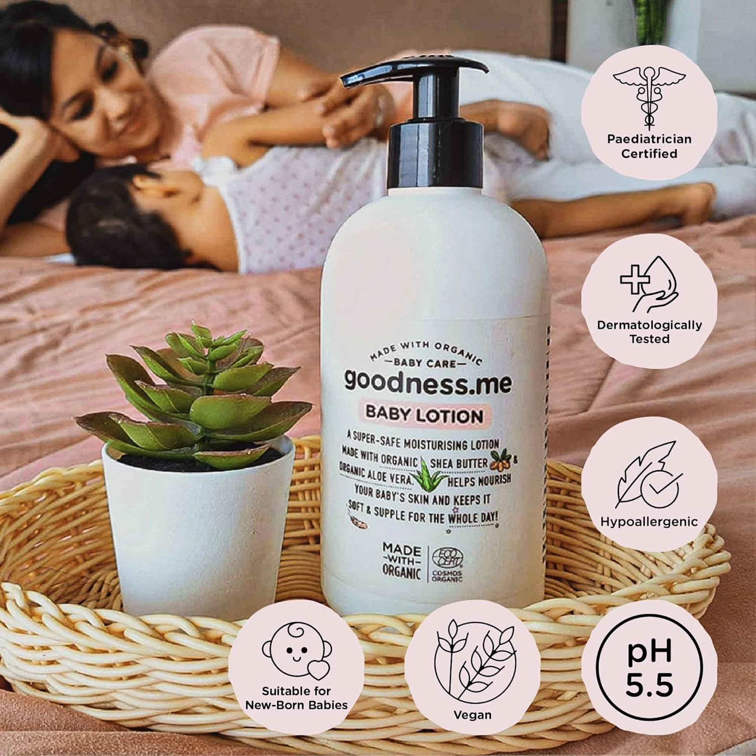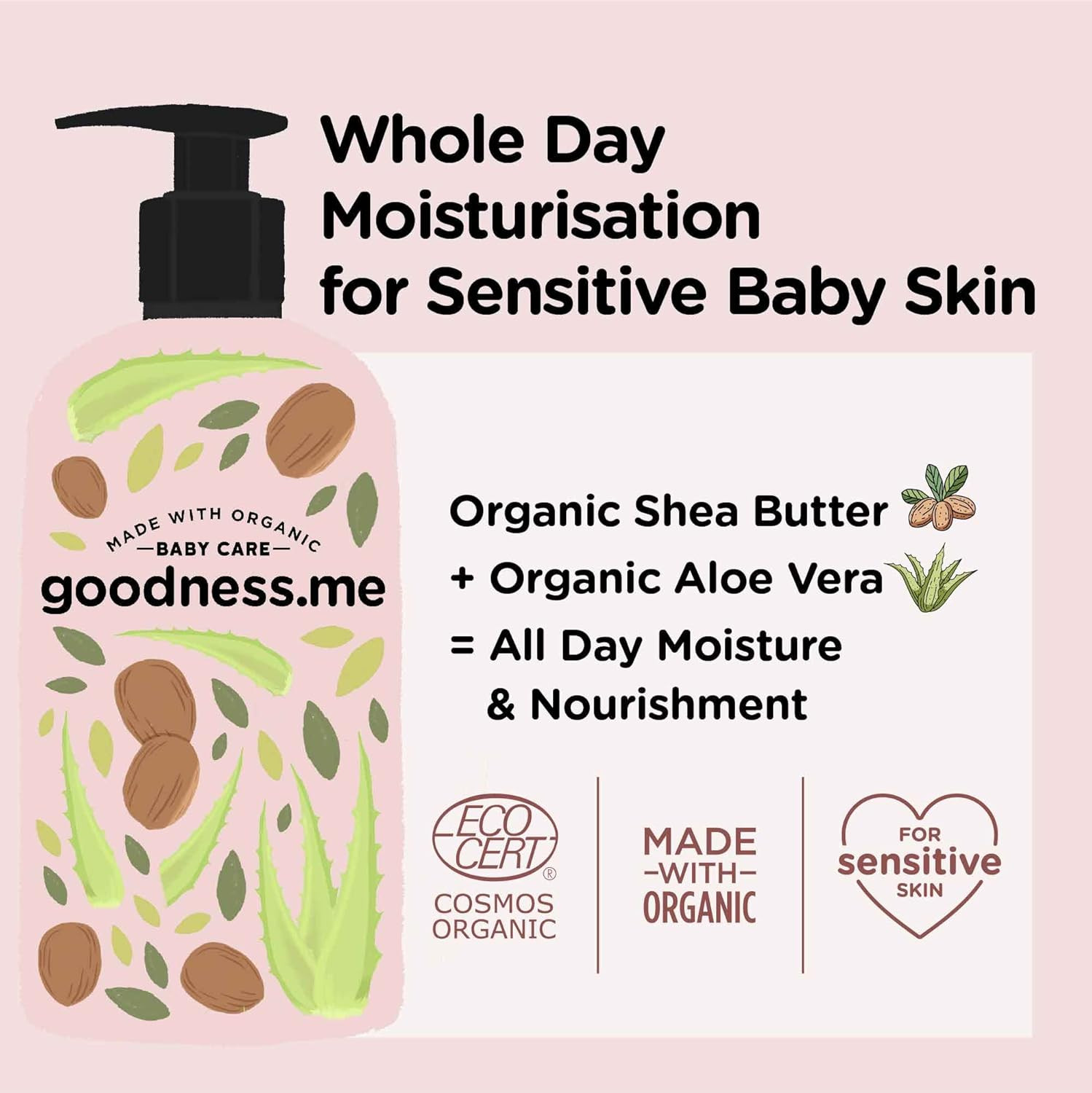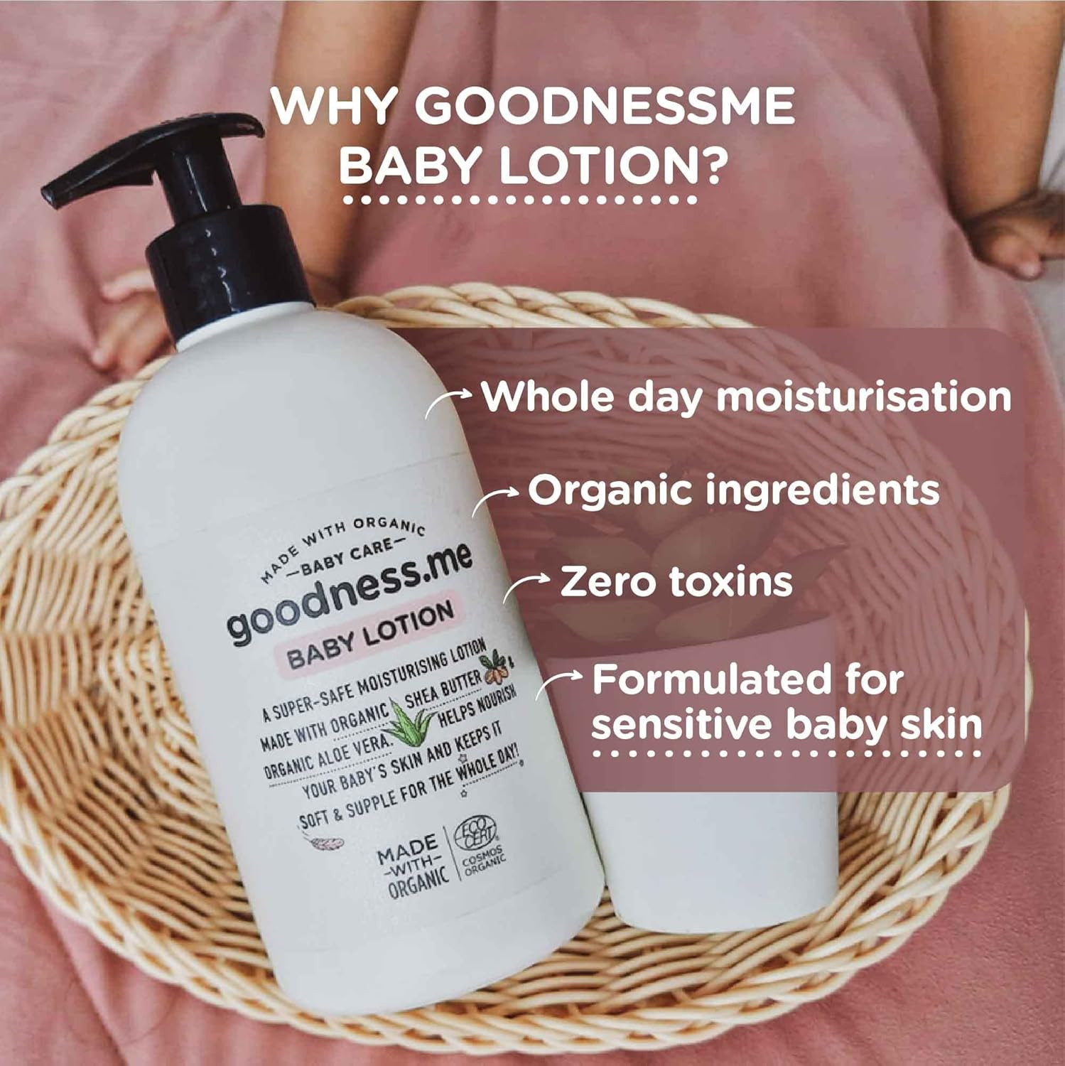 GOODNESS.ME – Baby Lotion, a gentle and nourishing formula designed specifically for your little one's delicate skin. Enriched with natural ingredients, this light and creamy lotion provides all-day hydration, leaving your baby's skin feeling soft, smooth, and protected. Perfect for daily use after bath time or whenever your baby needs an extra touch of care, this lotion absorbs quickly without any greasy residue, ensuring your baby feels comfortable and cared for.
