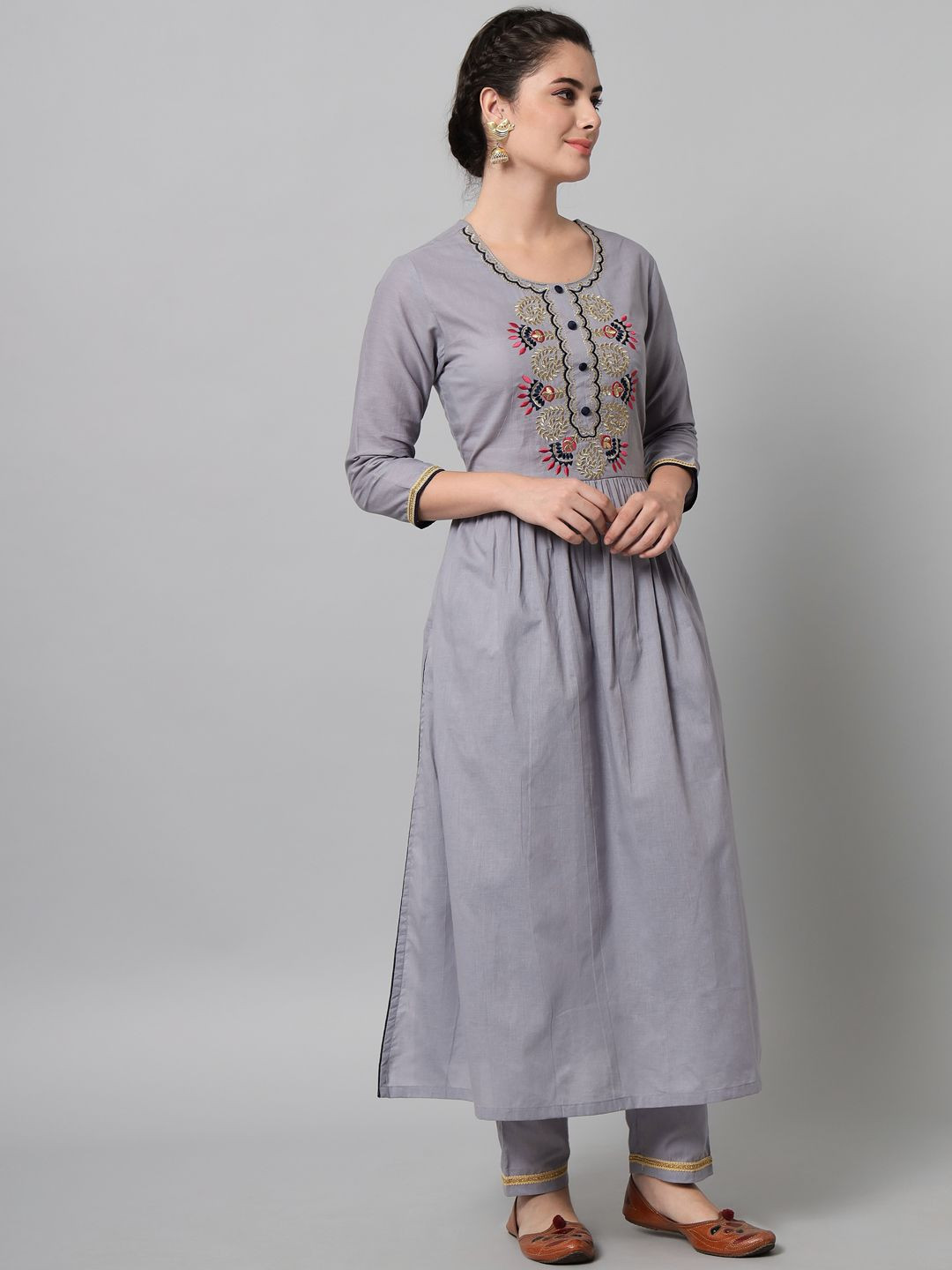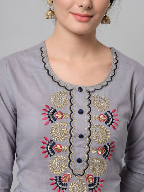 A graceful option for all occasions. This lovely kurta pant set is made from pure cotton fabric and is embellished beautifully embroidered on the front yoke. The kurta comes with a pair of pants featuring two spacious pockets, and elastic at the back. This design is easy to style as workwear or to be worn at social gatherings.