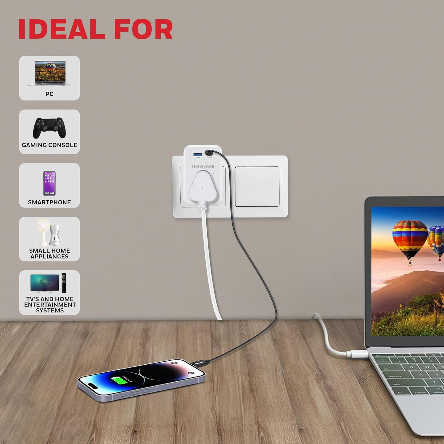 Honeywell 3 Out Surge Cube, Spike Guard, 1 Outlet, PD20W & USB A Port, 7500Amp, Charge On The Go, Device Secure Warranty, Automatic Overload Protection, 3 Years Manufacturer Warranty