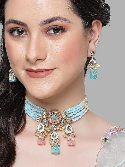 Karatcart Gold Plated Pink and Light Blue Beaded Kundan Jewellery Set for Women. Our products are designed with high-quality material and these products are enhanced with plating that are skin-friendly & with love to reach your heart.