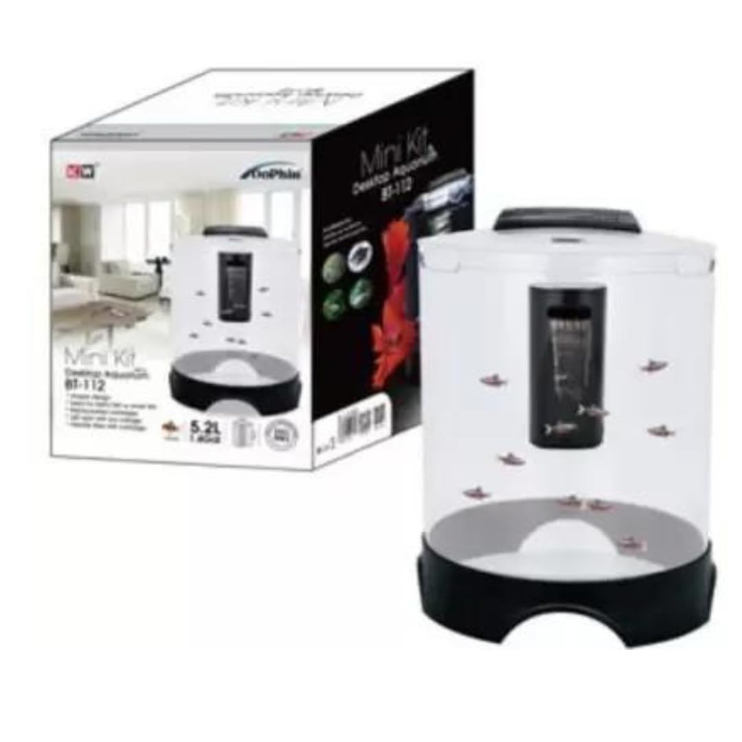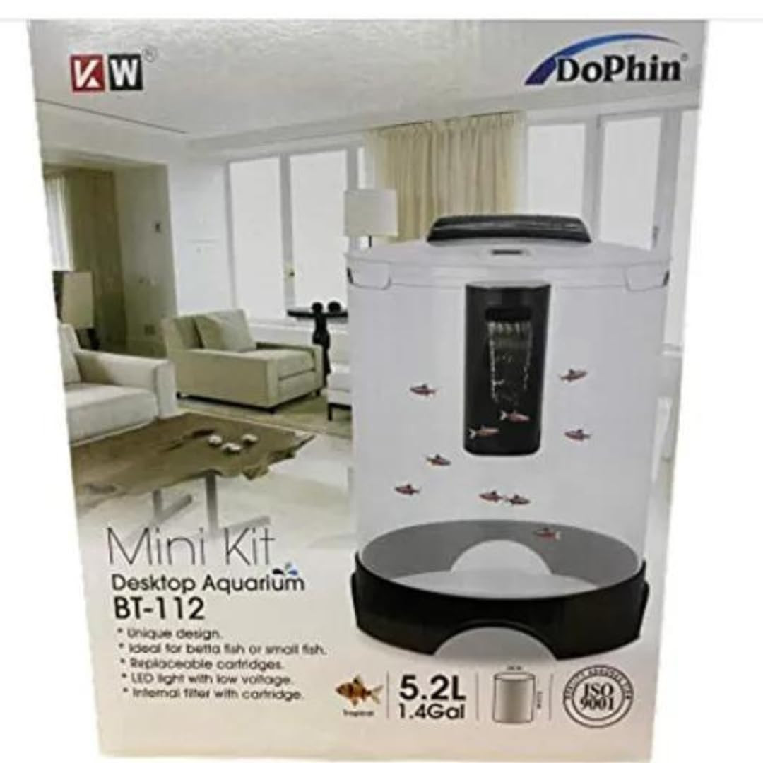 KSH Store-DoPhin Round Mini Tank BT-112, for Small Fish and Aquatic Plants (5.2 L, Rust Resistant) with LED Light and Internal Filter,4 INCH Plant and Fish Food. (BT-112)