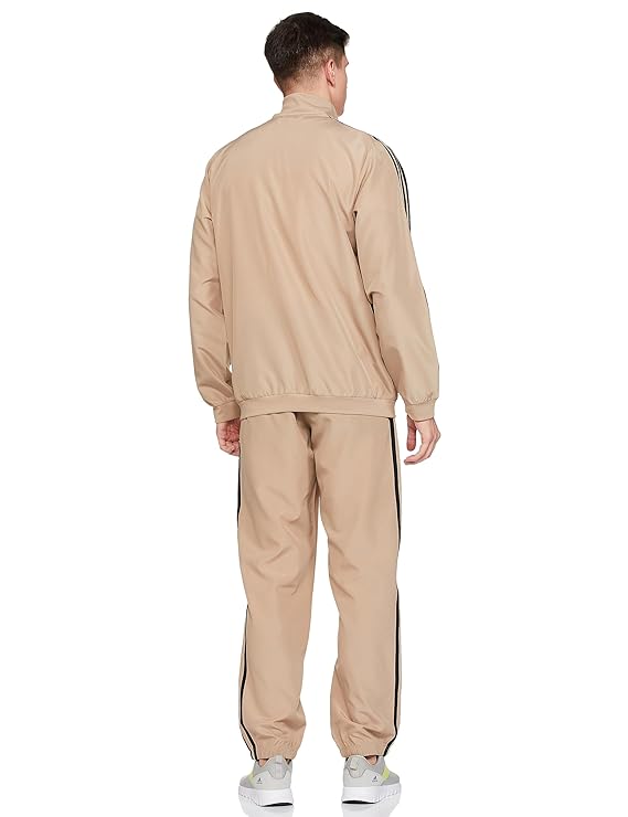 Mens track suit sports performance for male adult. Regular fit top front and back body, top pkt facing. Bottom pants front and back body, bottom pkt facing. Top collar, hem and sleeve rib, bottom pants cuff rib. Bottom tiecord and waitband. Top left chest and left leg embroidery liner logo screen print at left sleeves.