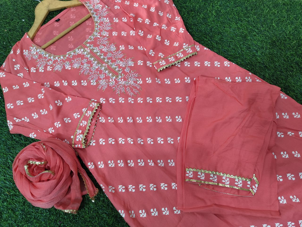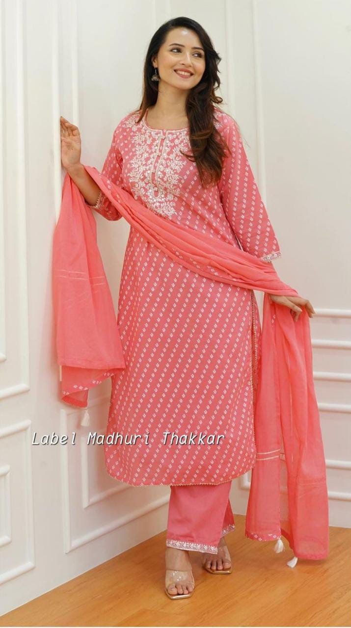 Premium quality suit WD heavy yoke and heavy sequins & EMB work details, EMB border dupatta 3 pc set dupatta fabric shiffon nd kurti pant fabric heavy quality rayon