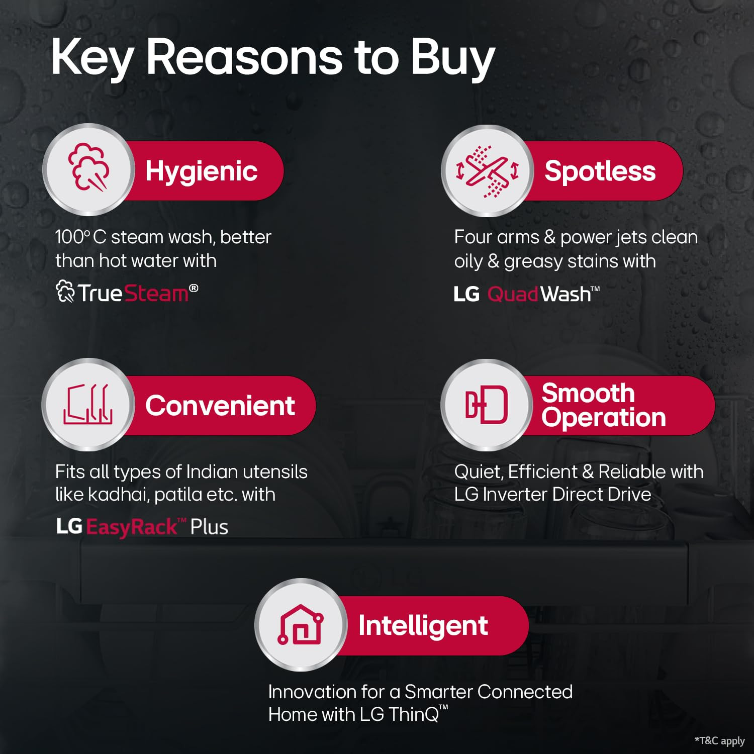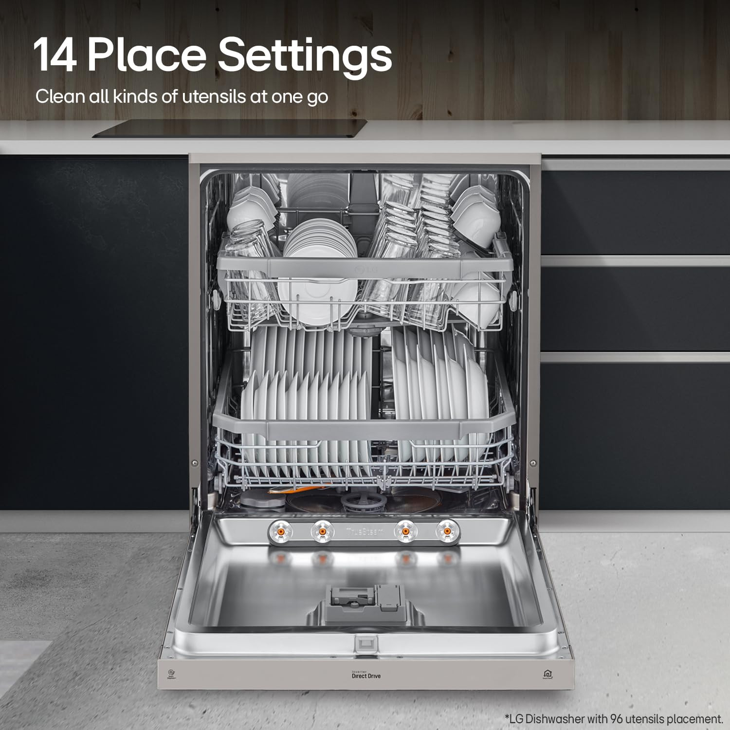 Capacity – 14 Place Settings: Suitable for families with 3 - 6 members | LG Dishwasher with 96 utensils placement - Upper rack: 6 Bowl set(250 ml), 8 Glass Set(300 ml), 40 Spoon/Fork/Knife set, 6 Quarter Plate, 6 Tea/Coffee cup; Lower rack: 12 Large Dinner Plate, 6 Small Dinner Plate, 1 Kadhai ( 5L Capacity), 1 Cooker( 5L Capacity), 1 Tea Container( 2.5L Capacity), 2 Strainer, 6 Glass bowl Container, 1 Tawa