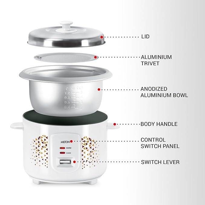 It has outer cool touch body and handle makes it easy to carry. The inner bowl and trivet is made up of anodized aluminium which makes it sturdy and durable. It comes with Measuring cup and spatula for convenience.