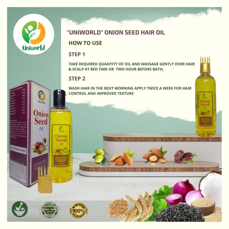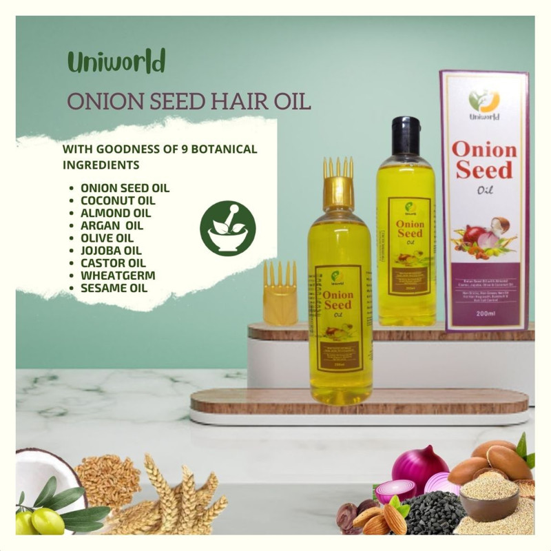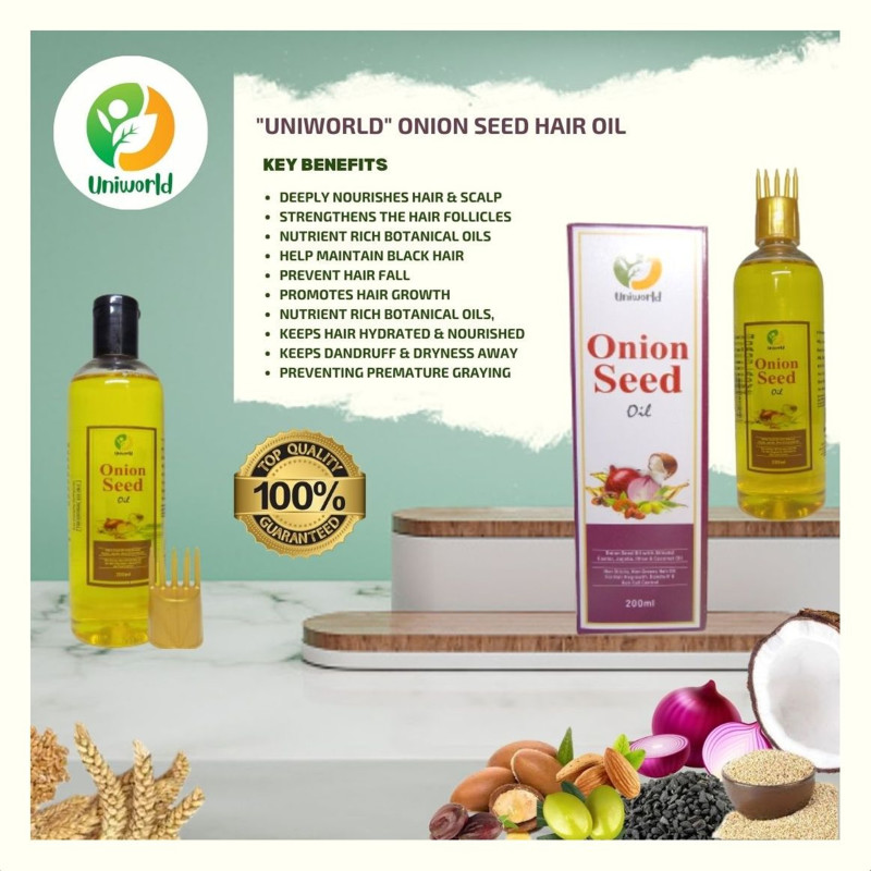 Introducing "UNIWORLD" Onion Seed Hair Oil, a luxurious blend of 9 botanical ingredients carefully selected to provide exceptional benefits for your hair. Each ingredient is chosen for its unique properties, working together to nourish, strengthen, and rejuvenate your locks.