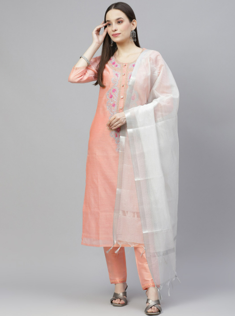Peach coloured yoke design Kurta with Trousers & dupatta