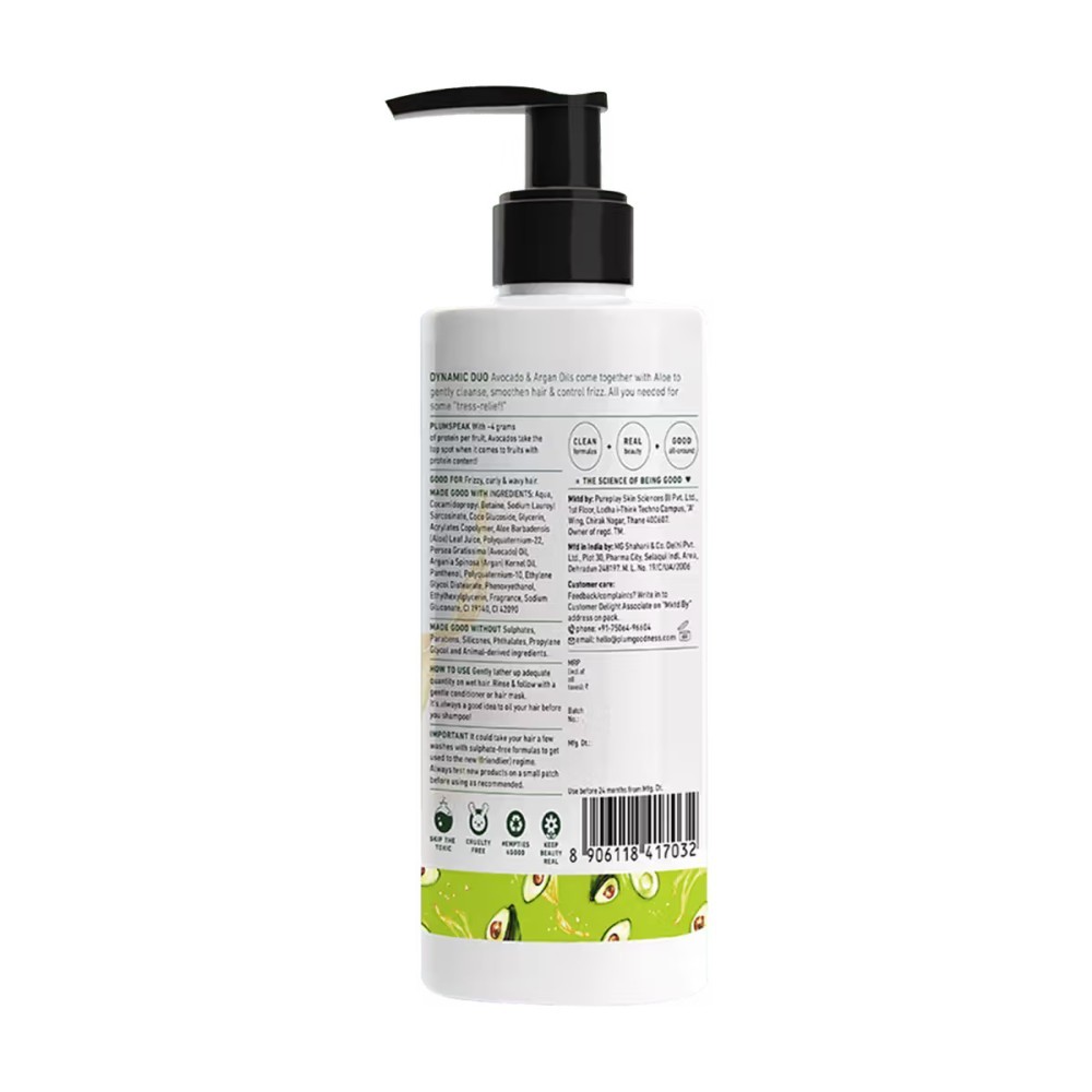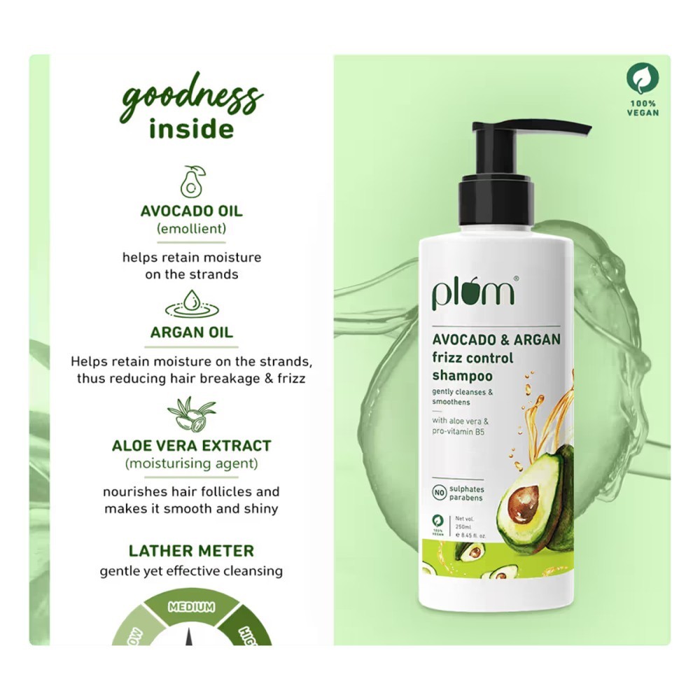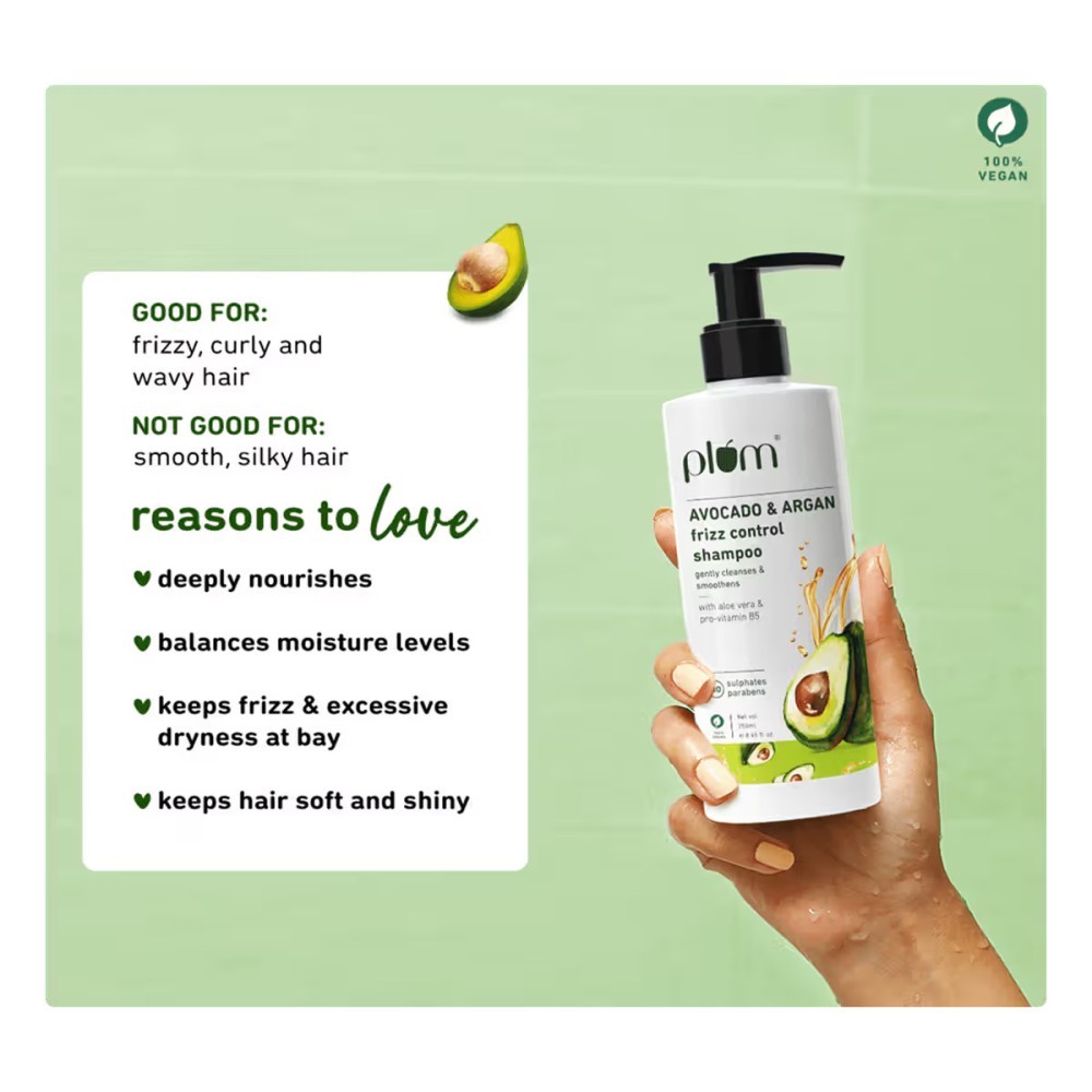 Plum Avocado & Argan Frizz Control Shampoo (250 ml) is a nourishing, sulphate-free formula crafted to tame frizz while restoring softness and shine to your hair. Designed especially for curly, wavy, and frizzy hair types, it gently cleanses without stripping away natural moisture—leaving your hair smooth, manageable, and healthy-looking.