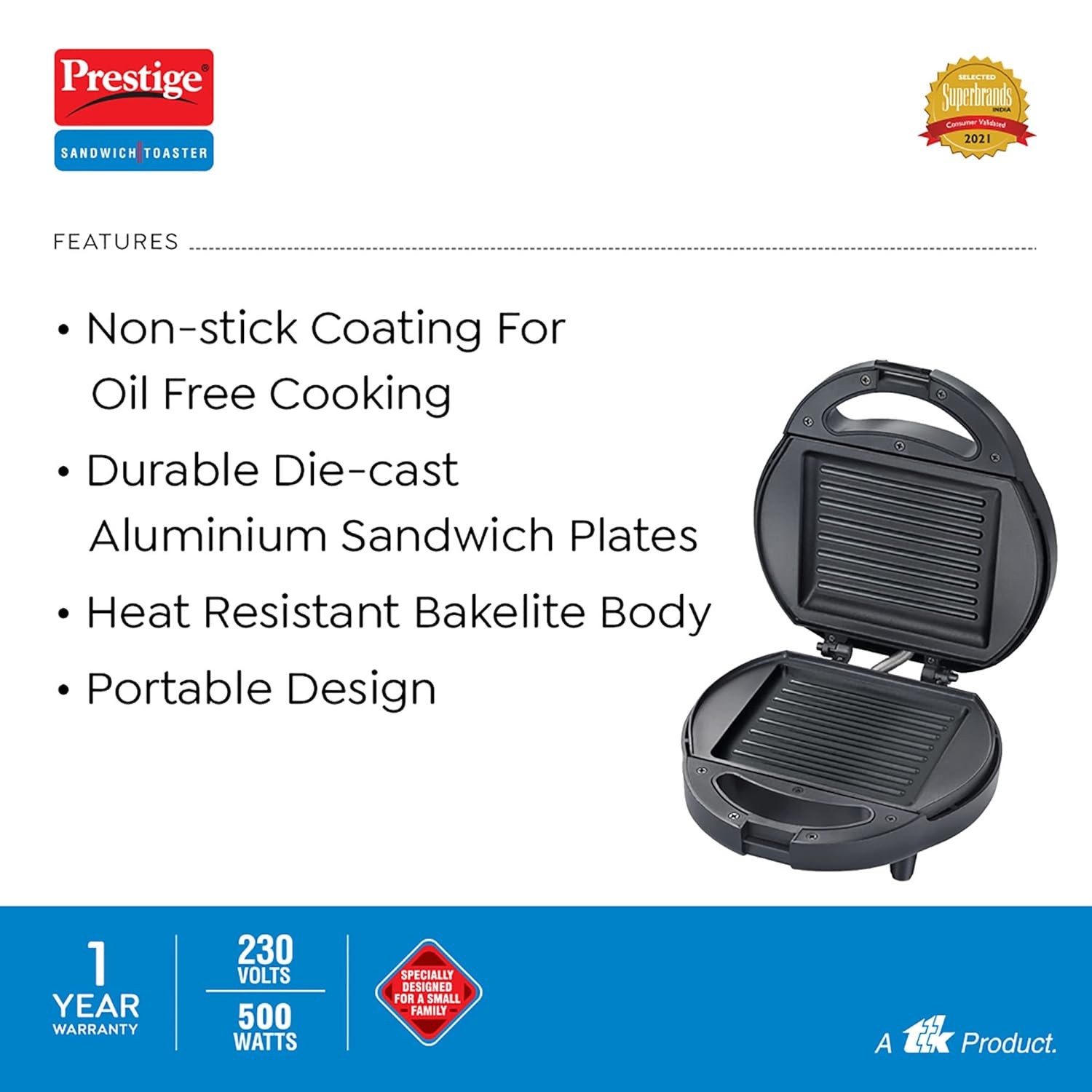 Prestige PGSP Single Sandwich Toaster with Fixed Grill Plate(500W, Black, Non-Stick