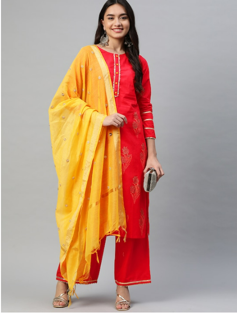 Red Floral Regular Pure Cotton Kurta with Palazzos & With Dupatta -