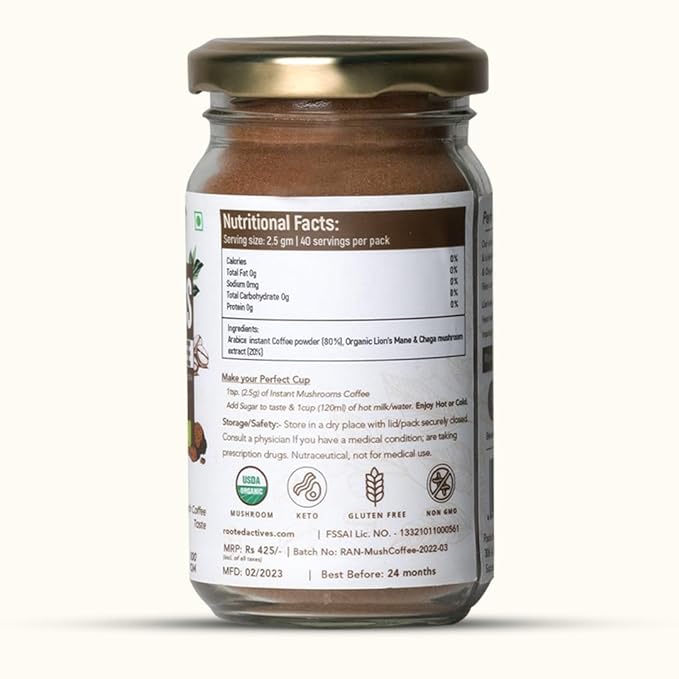 ROOTED Actives Wellness Muhroom Coffee (100 G), IC(Lion's Mane & Chaga - 20%) |Focus, Energy, Immunity & Heart Health, Powder, Jar Visit the ROOTED Store