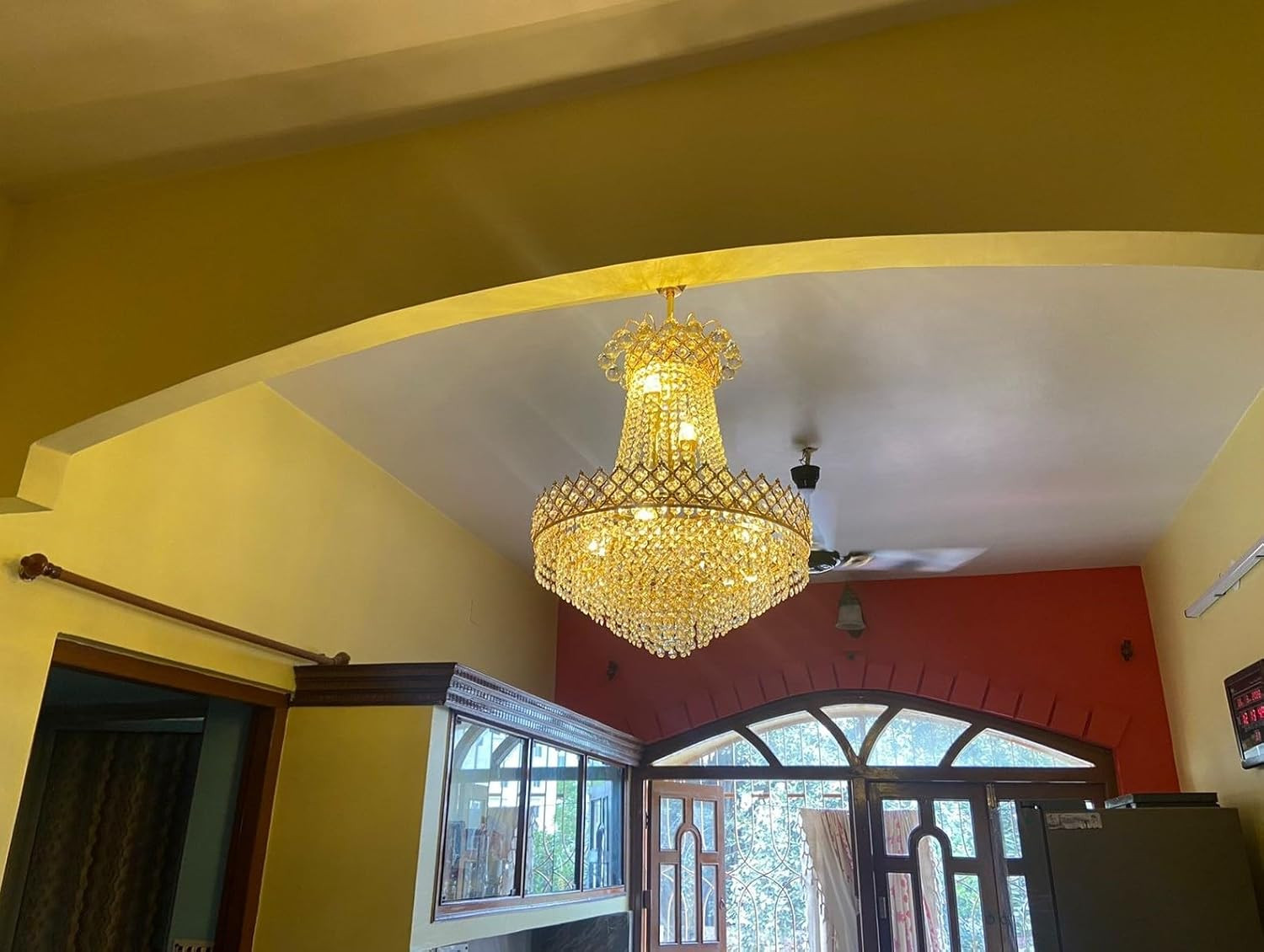 • The Crystal Chandelier is a stunning decorative piece that adds a touch of glamour and elegance to your home, office, living room, bedroom, drawing room, kids room, guest room, hotels, etc. Its sparkling crystals create a beautiful play of light, enhancing the overall aesthetics of the room.