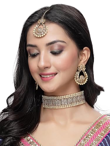 • Exquisite Design: Sukkhi presents a captivating Indian ethnic jewelry set, featuring a gold-plated choker necklace adorned with dazzling LCT (Light Champagne) Kundan stones and beads. This set includes matching earrings and a maangtika, showcasing the richness of Indian craftsmanship.