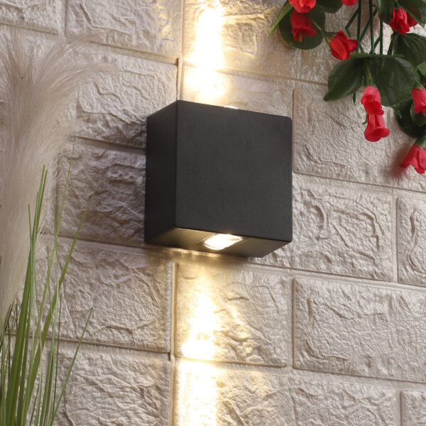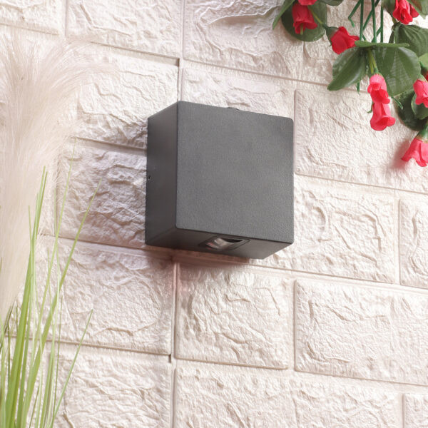 Square aluminum die cast outdoor wall light in gray finish using high quality LED and driver with high success rate having less than 0.5% replacement. Also available in one way, three way and four way design. It is a two way light having lens to give a narrow beam. This in combination with its variants is preferred by the lighting designers to create a lighting effect with beams crossing each other in a single wide wall, and multiple units are used to create the design. It can be used in both indoor and outdoor applications such as Stair case walls, terrace walls, outdoor walls, boundary walls, open parking, stilt parking, basement parking, passage walls. IP54 rated. Protection against splashed water can be customized as per requirement for bulk quantities.