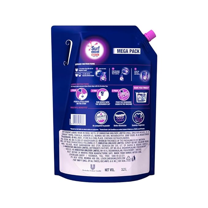 Surf Excel Matic Front Load Liquid Detergent 3.2 L Refill, Designed for Tough Stain Removal on Laundry Designed for Tough Stain Removal on Laundry in Washing Machines - Mega Pack