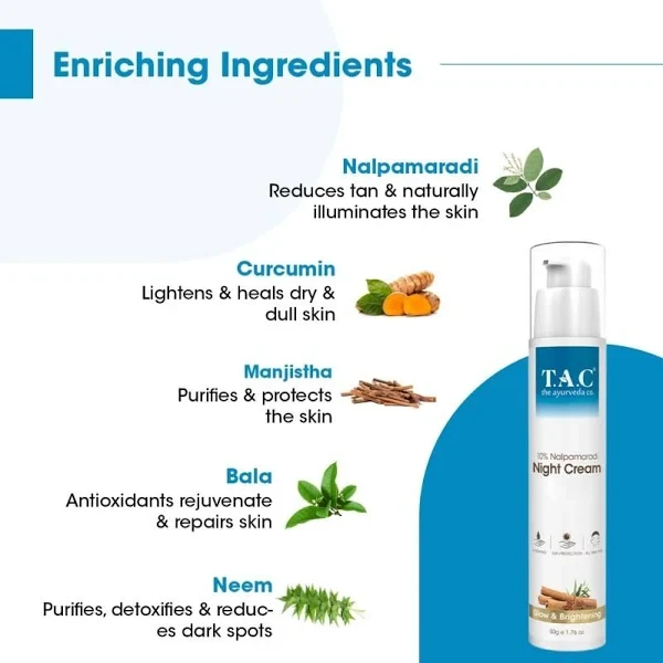Unlock the secrets to radiant skin with TAC – 10% NALPAMARADI NIGHT CREAM. This luxurious night cream is formulated with a potent blend of traditional Ayurvedic ingredients, including NALPAMARADI, renowned for its skin-brightening and rejuvenating properties. Designed to work overnight, this cream nourishes, hydrates, and restores your skin while you sleep, promoting a youthful glow and reducing the appearance of dark spots and uneven skin tone. Experience the transformation as you awaken to a visibly softer, smoother, and revitalized complexion.
