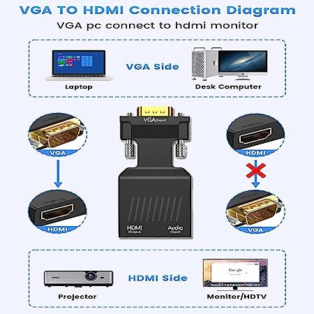 - One-Way Converter: The VGA to HDMI adapter can not be used as an HDMI to VGA converter cable, it is a VGA to HDMI (male to female) converter.