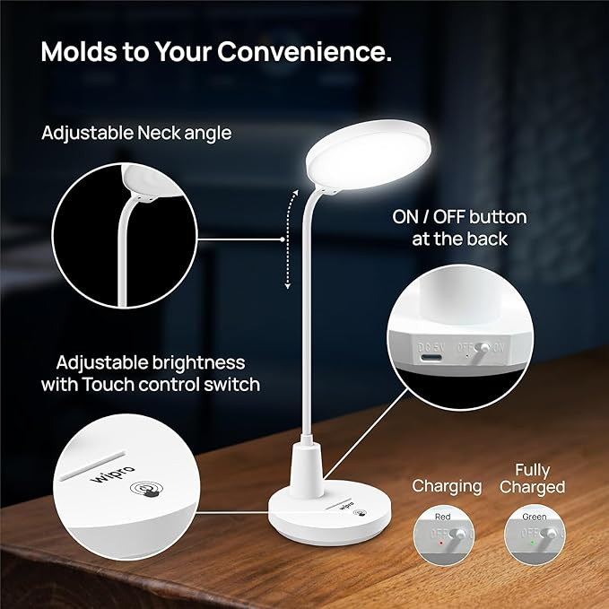 Smart Flexible design: You can easily change the angle of the Wipro table lamp with its flexible neck. It gives a 360 degree light distribution creating a colourful ambience for bedroom, living room or workplace