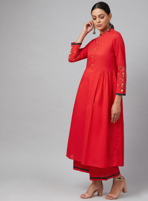 Red & Green Solid Kurta with Palazzos & Dupatta -