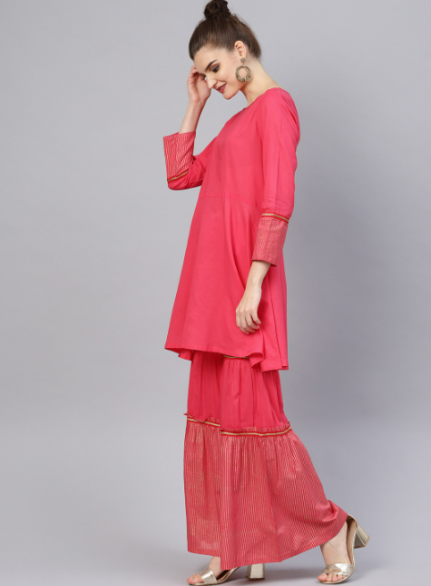 Women Pink Pure Cotton Kurti with Sharara & With Dupatta -